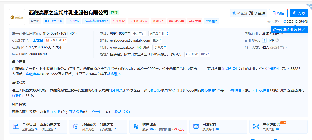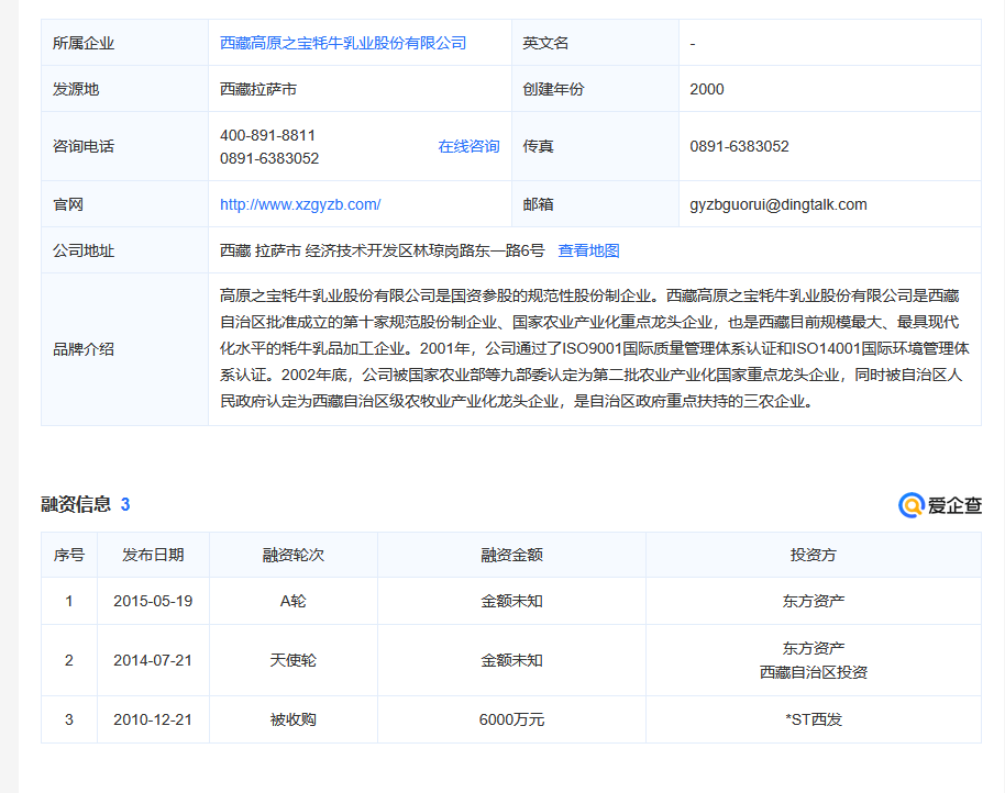 高原之宝2000年成立,后被西藏自治区政府国资委的东方资产收购,法人代表王世全。西藏高原之宝牦牛乳业股份有限公司 (曾用名:西藏高原之宝牦牛股份有限公司) ,成立于2000年,位于西藏自治区拉萨市,是一家以从事食品制造业为主的企业。企业注册资本17314.3322万人民币,实缴资本14625.7222万人民币,并已于2014年完成了战略融资。